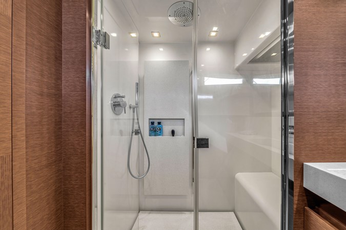 This motor yacht has been designed to fully enjoy being at sea, whether on open waters or at anchor, with multiple living spaces on deck, including a vast cockpit and an immense terrace on the flybridge. Bathed in light, the forward, main deck owner’s cabin is a quiet, intimate living space with a private access, a large walk-in closet, a wide desk, an independent head and shower compartment.