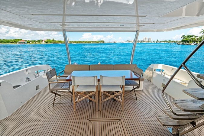 The flybridge features a hardtop with retractable sunroof, wet bar, dining area, and sun loungers, while the foredeck offers a private retreat with seating and a sunpad. Aft, the cockpit provides shaded alfresco dining, and the hydraulic swim platform allows effortless access to the water for tenders and toys.