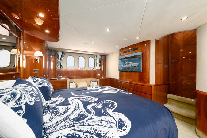 Performance : Powered by C-32 Caterpillar engines, it delivers a cruising speed of 27 knots. It also includes bow and stern thrusters for enhanced maneuverability.