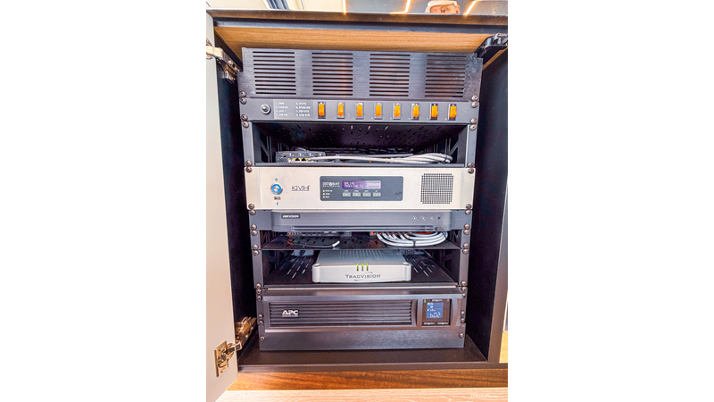 Professional custom pull out AV/Equipment rack with premium communication system, four onboard systems including high power wireless bridge/shore marina Wifi, 5G/LTE cellular system, Starlink, SATCOM D Sat tracking TV.