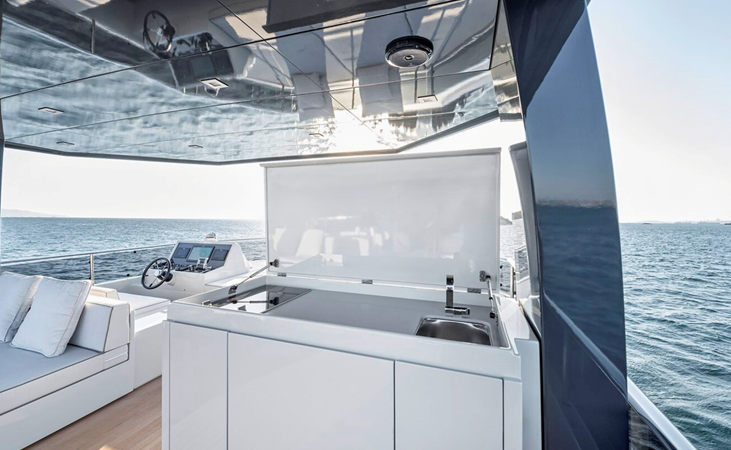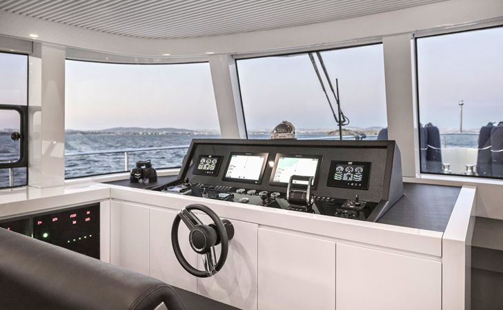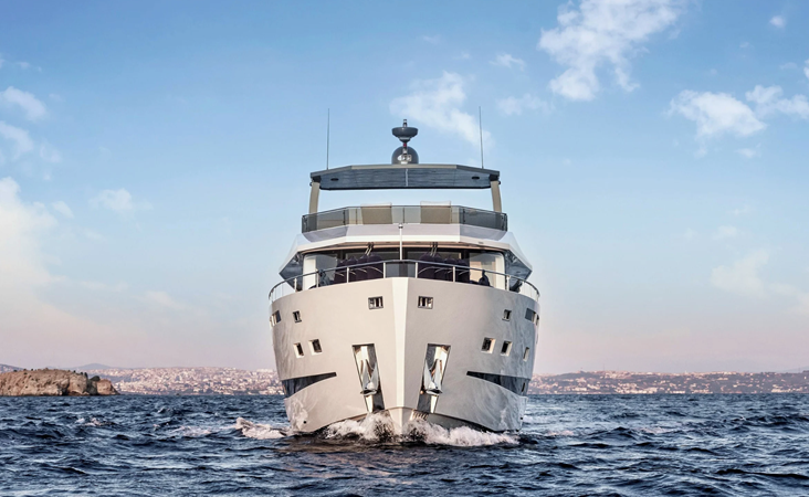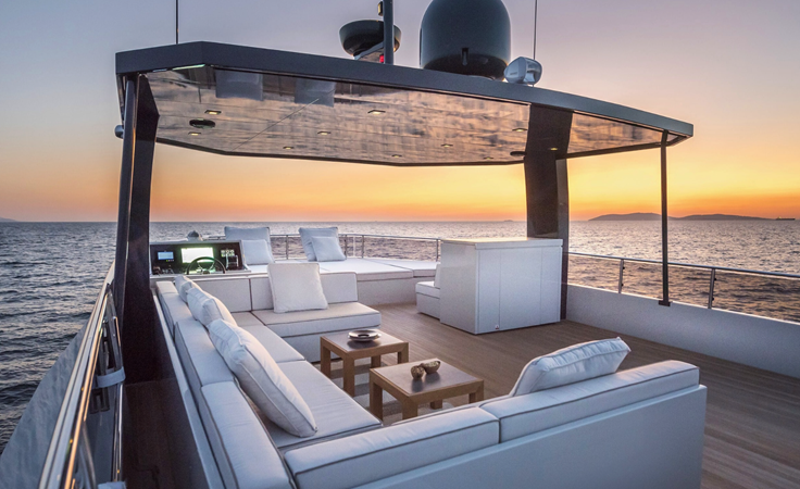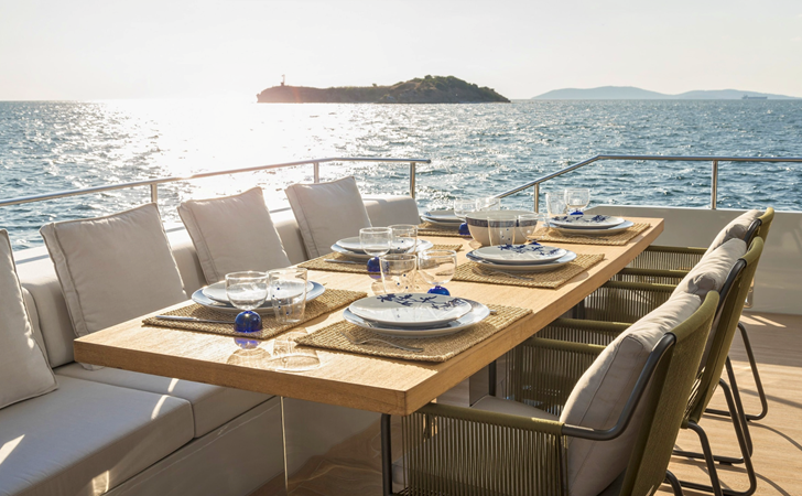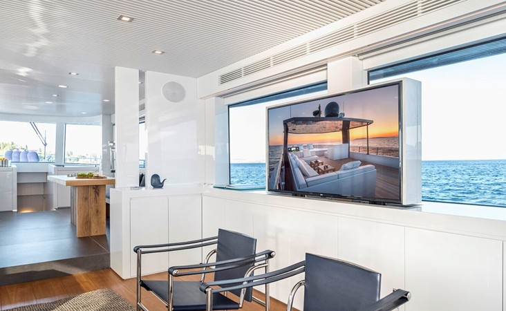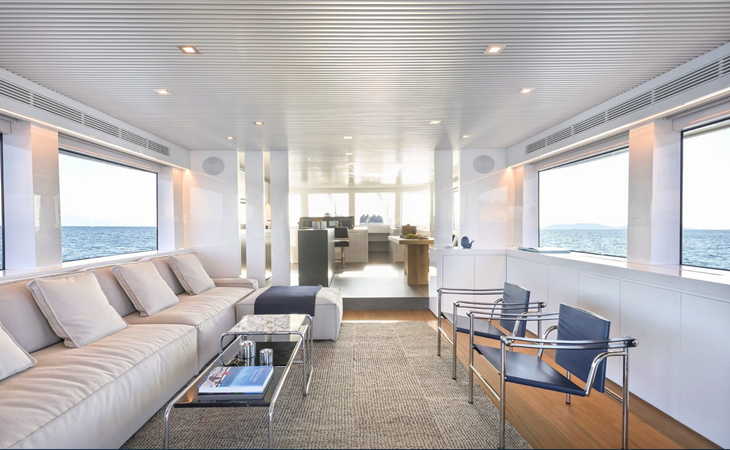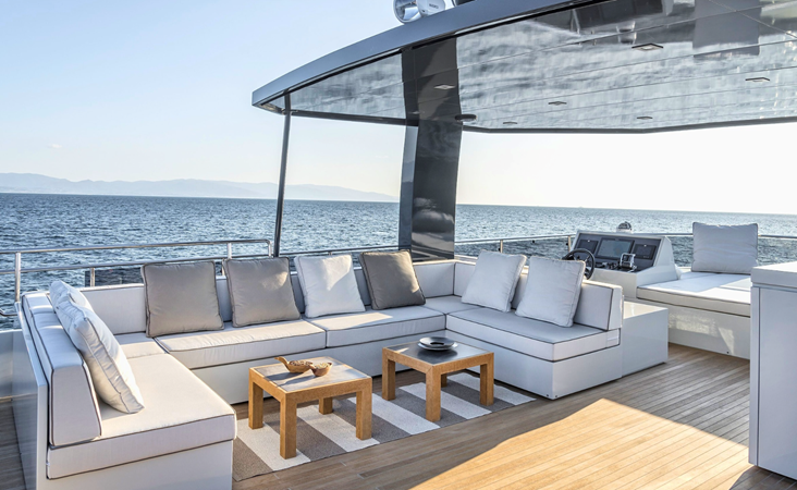 Outdoor areas include a cockpit dining space and a large flybridge with sunbeds, generous seating, and an additional helm station. Bow and stern thrusters, twin generators, and a hydraulic swim platform further enhance the yacht’s practicality.