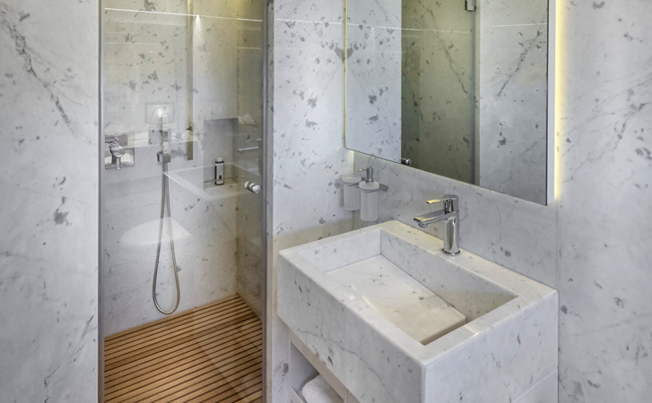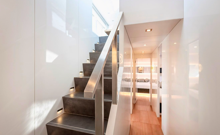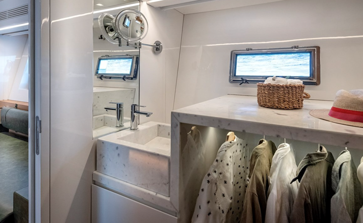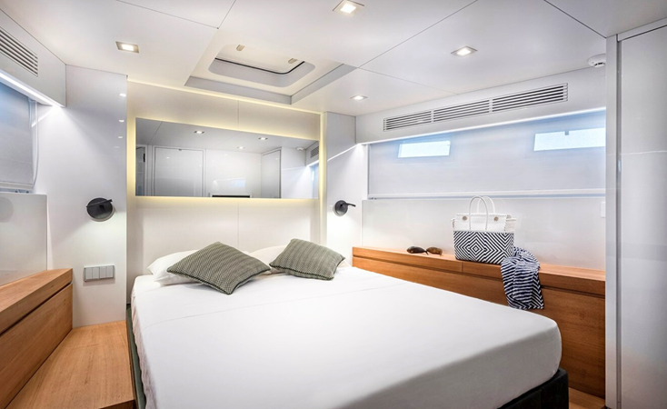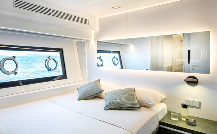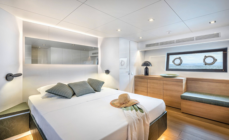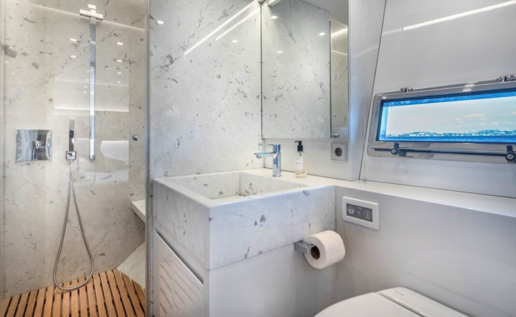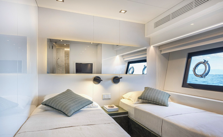 She accommodates eight guests across four cabins, including a full-beam midships master, a VIP cabin forward, and two additional guest cabins, all with en suite bathrooms. Separate crew accommodation provides space for up to four crew members if required.