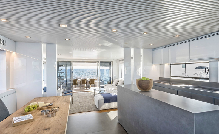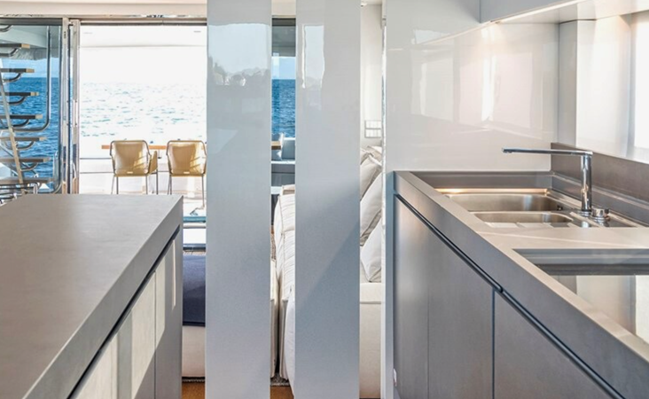 The interior is bright and functional, with a spacious saloon, a dinette, and a well-equipped galley featuring an island work surface, a hob, a fridge, a freezer, and good storage.