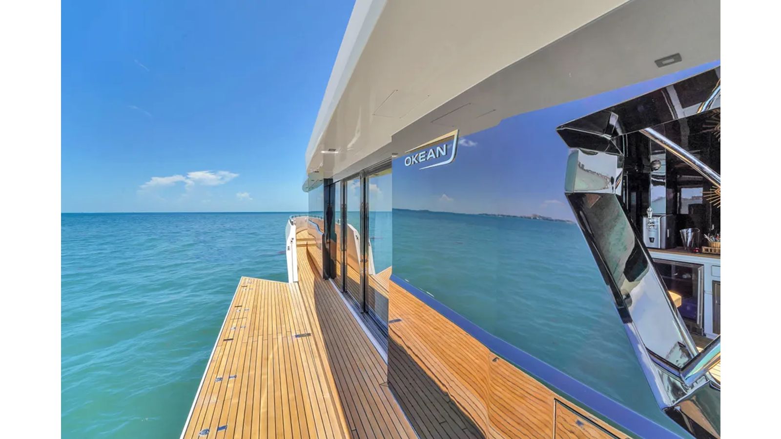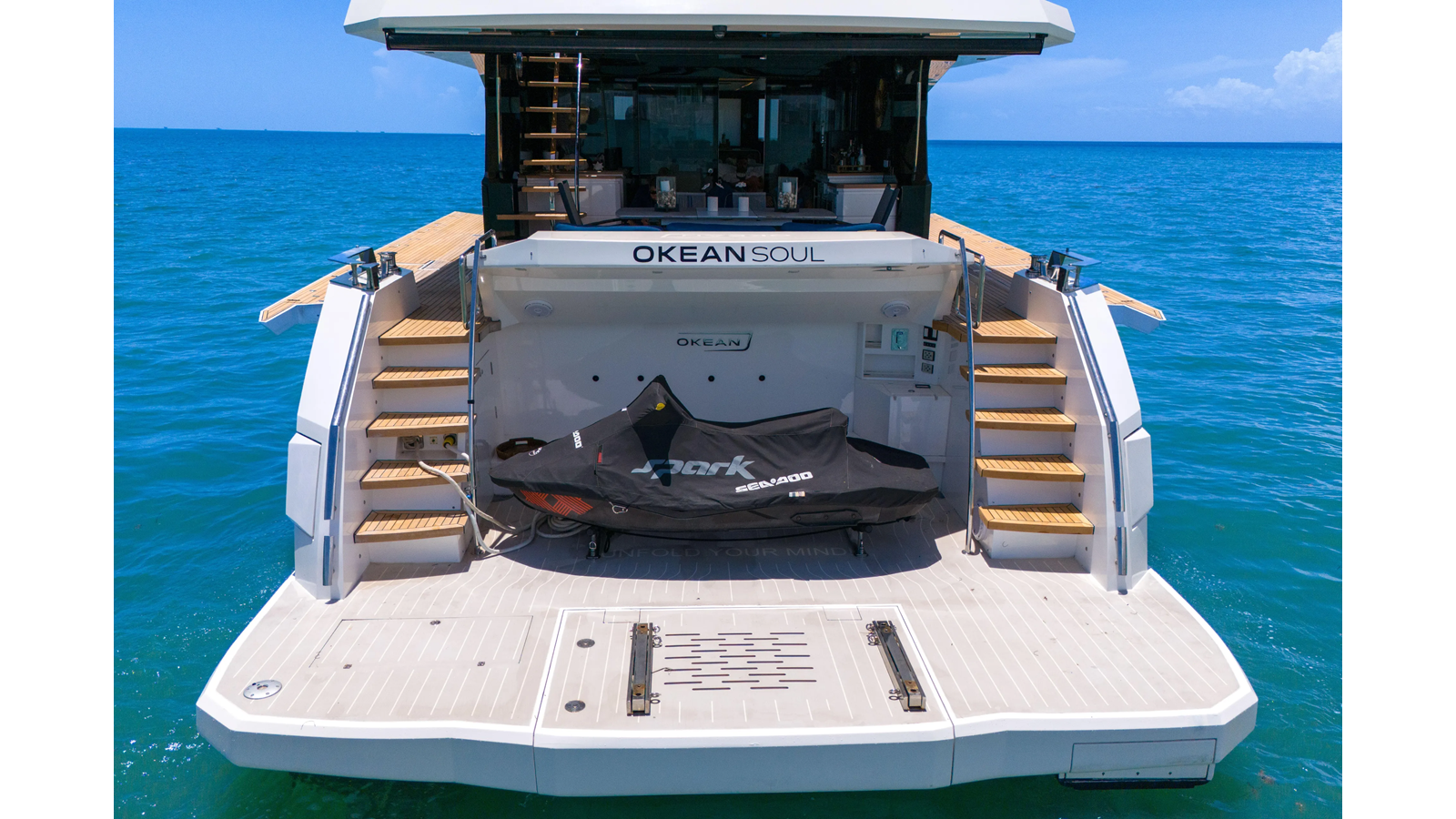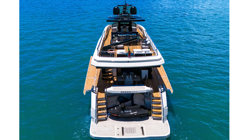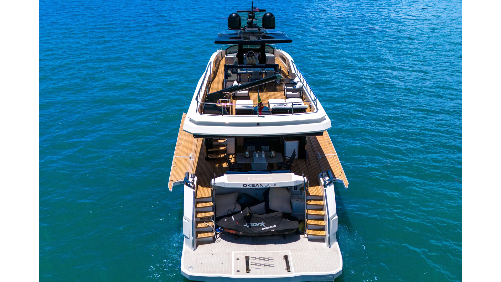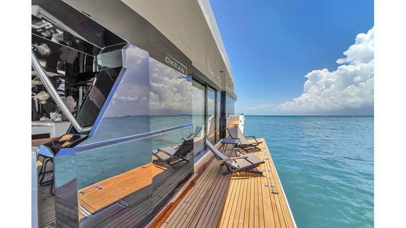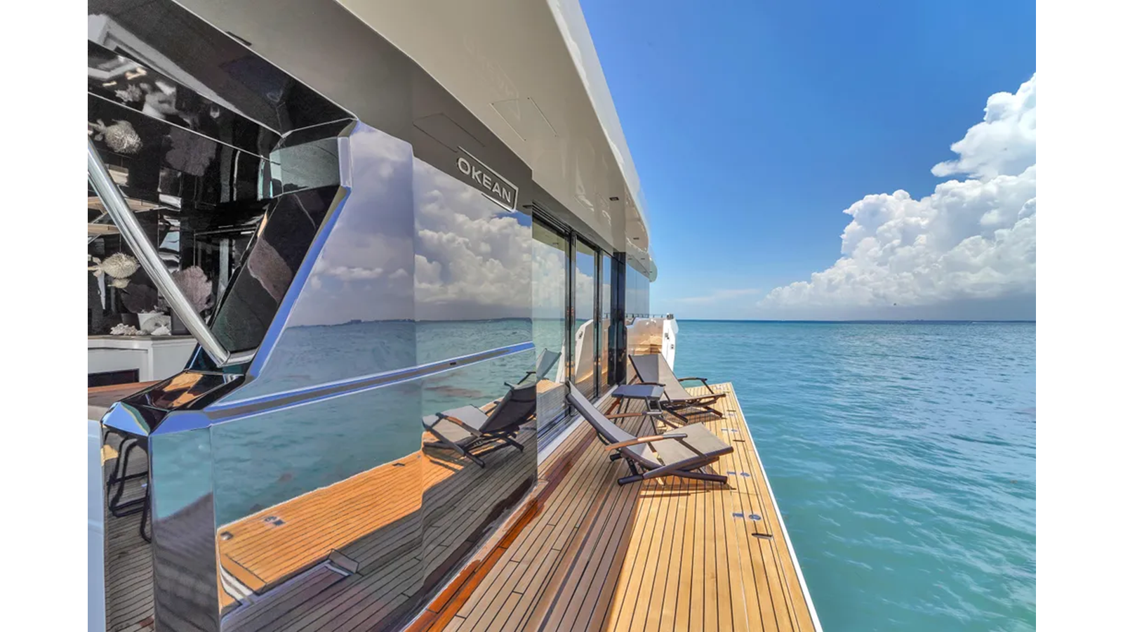 Let nature flow. This is the OKEAN 80 Yacht Lounge concept. It allows all deck doors to open completely, integrating the indoor and outdoor environments, creating a terrace for you to enjoy with up to 30 guests over the sea. Nearby is the Beach Club at the stern of OKEAN 80. The multiple positions the submersible sliding platform offers allow you to establish a new relationship with the ocean. Dive safely, experience nature intensely, and return to the boat comfortably.