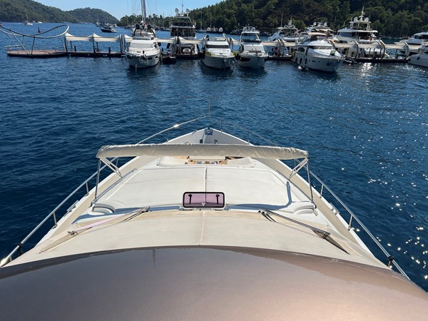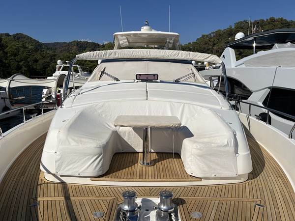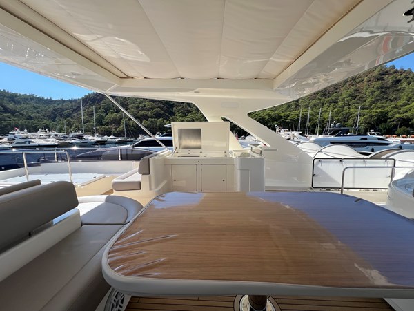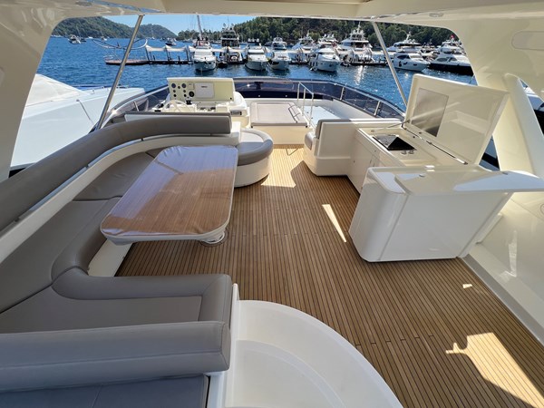 • Exterior: Expansive flybridge with sunbathing and dining areas, large aft cockpit, and foredeck seating