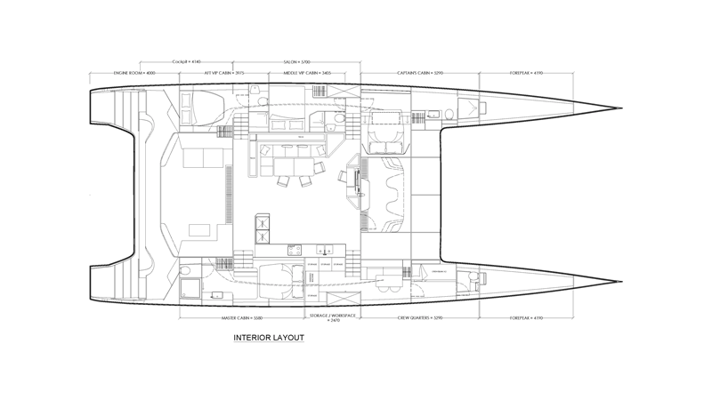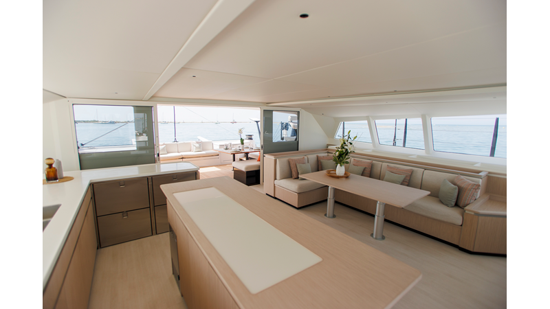 The layout of the Gunboat 80 is meticulously designed to maximize performance, comfort, and versatility. The bridgedeck salon serves as the heart of the yacht, seamlessly connecting to the spacious aft cockpit for an uninterrupted indoor/outdoor living experience. Expansive windows flood the interior with natural light, while customizable spaces allow owners to tailor the layout to their lifestyle.