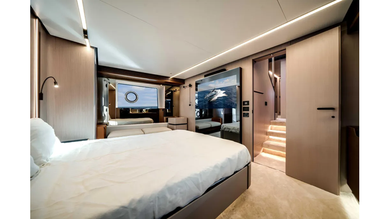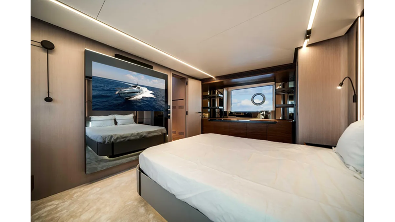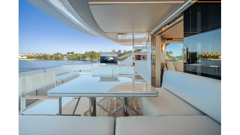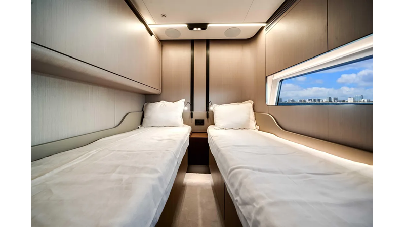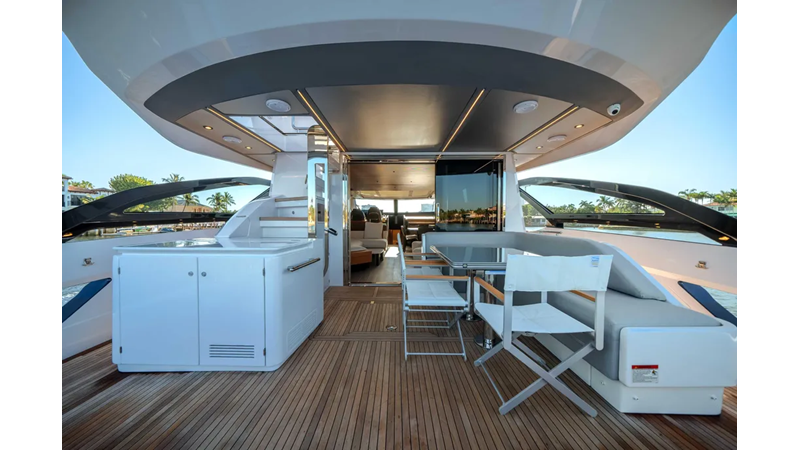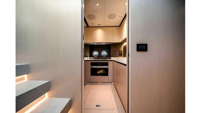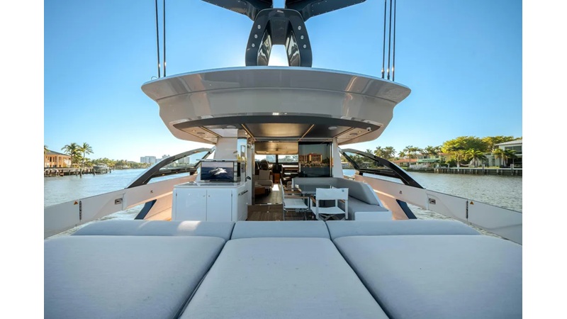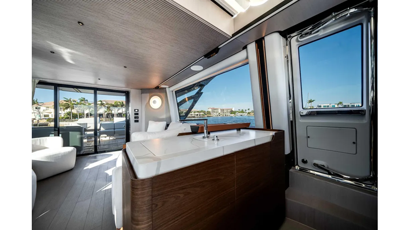 One of the highlights is the aft garage and beach club setup. The large garage door drops down to create a stunningbeach lounge, perfect for relaxing by the water. Inside, the garage is spacious enough to accommodate two jet skis or abig tender and one jet ski.