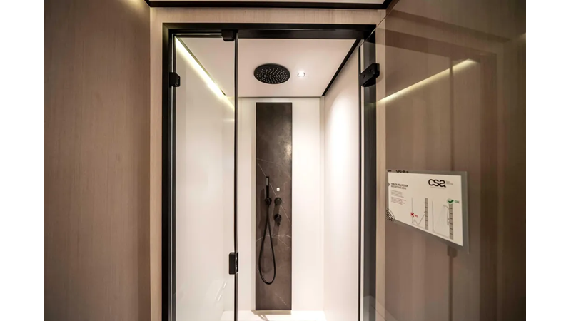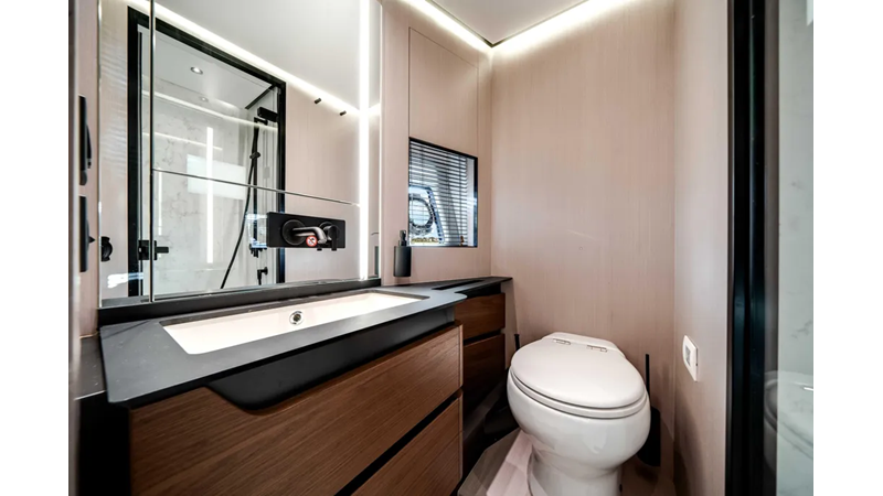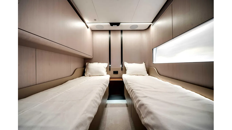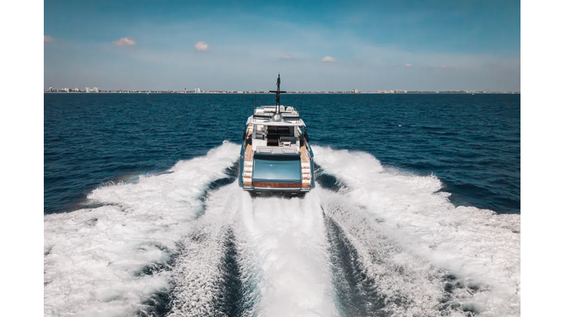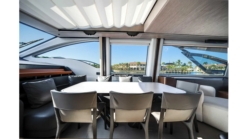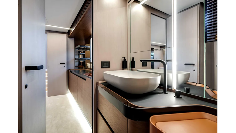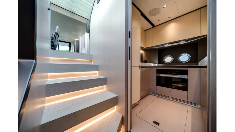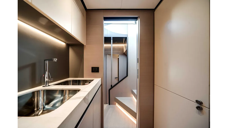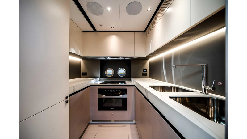 One of the highlights is the aft garage and beach club setup. The large garage door drops down to create a stunningbeach lounge, perfect for relaxing by the water. Inside, the garage is spacious enough to accommodate two jet skis or abig tender and one jet ski.