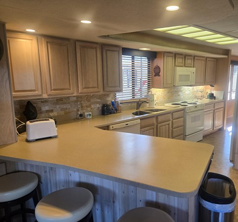 The boat features an open and spacious galley with a newer side by side refrigerator/freezer (2021), a 4 burner range/stove combo, microwave, wine cooler and dishwasher.