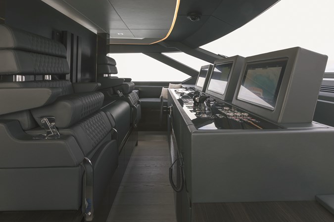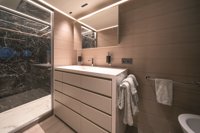 The yacht’s sundeck offers a unique twist—an “open-roof” lounge for dining beneath the night sky or a serene sunbathing area for private relaxation. Below deck, there might be up to four guest cabins, including a spacious aft master stateroom and a VIP suite forward, both full-beam for maximum comfort. For instance, two twin cabins amidships will provide versatility, featuring the innovative sliding bed system that transforms into a double bed at the push of a button.
