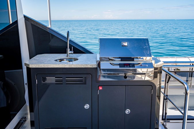 • Upper Deck Oasis: Choose between an open or enclosed bridge, with the enclosed version featuring a plush lounge for six, three ergonomic helm chairs, and a state-of-the-art helm. The aft sundeck boasts a large grill, ample drink storage, multiple seating options, and an optional hot tub for soaking in panoramic views.