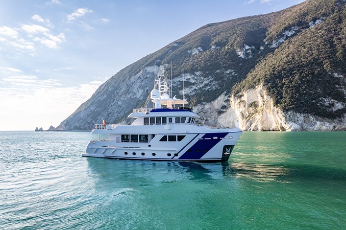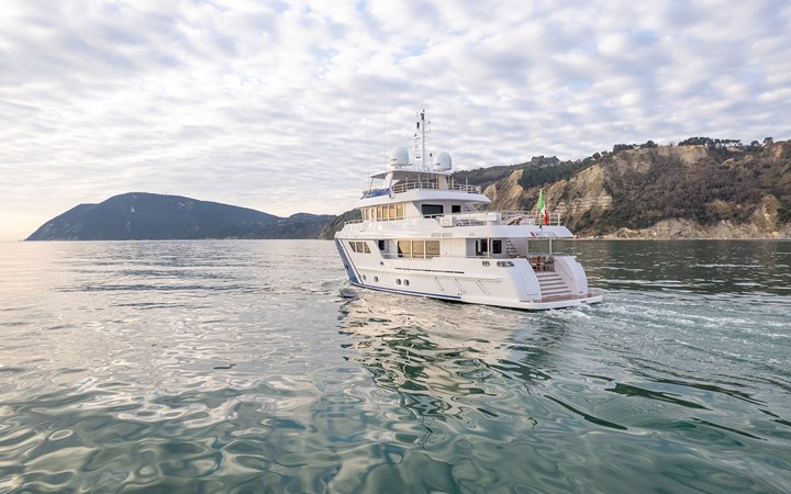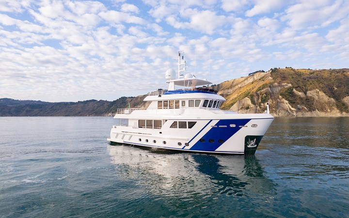 Measuring 26.30 meters, Empire is a compact and robust vessel, characterized by comfort and reliability. She is powered by twin Scania engines, each delivering 294 kW, and is equipped with three Northern Light Generators, providing a total of 155 kW of power. The yacht also features sodium-lithium chloride batteries for enhanced energy efficiency and is protected by a sophisticated anti-intrusion system.