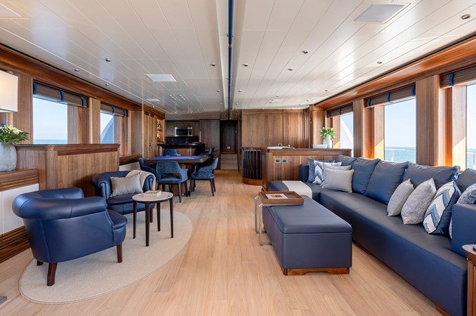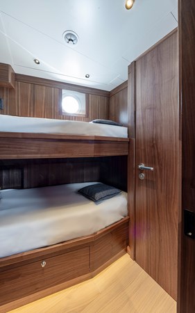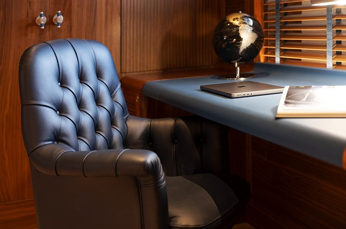 The interiors, designed by Alessandro Massari to the owner’s specifications for guest accommodations and style, radiates a sober, understated elegance. The designer created a warm, inviting ambiance by blending custom-made furniture with pieces from renowned brands like Poltrona Frau and Poliform. The Owner’s full beam stateroom is situated amidships on the Lower deck, providing ample space and comfort. Adjacent to this luxurious stateroom are two twin cabins, each equipped with a pullman bed to accommodate additional guests. At the forward end of the Lower deck, a VIP suite offers a private and elegant retreat.