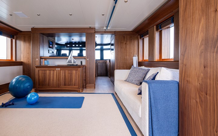 communication and movement for the crew. Empire’s Main deck is the epicenter of social activity, featuring both indoor and outdoor spaces for lounging and dining. A cozy bar enhances the social atmosphere, while the galley is conveniently equipped for meal preparation and service. The Upper deck is home to a spacious and well-equipped gym, catering to fitness enthusiasts, but it is also a cozy lounging area opening onto a properly furnished stern terrace. The wheelhouse, designed with Boening integrated monitoring and control systems, ensures ease of handling for the captain and crew. The Sun deck, furnished with loose furniture and sunbeds, offers an ideal setting for open-air relaxation and enjoyment.