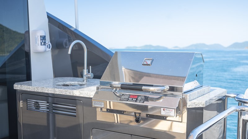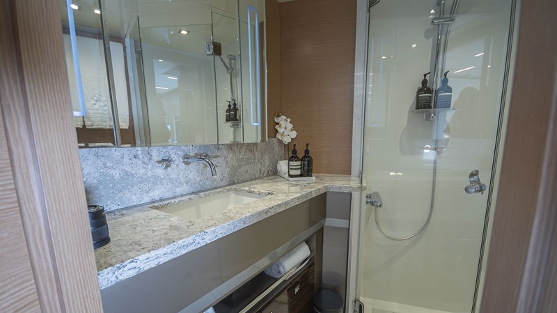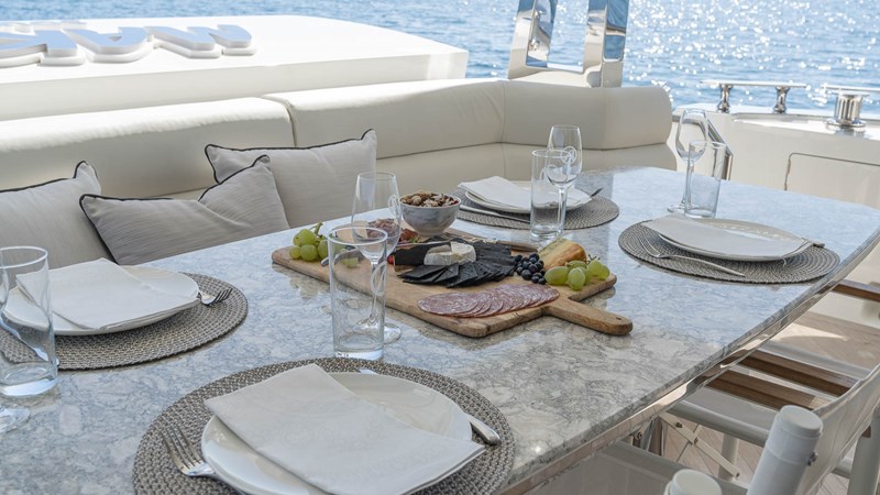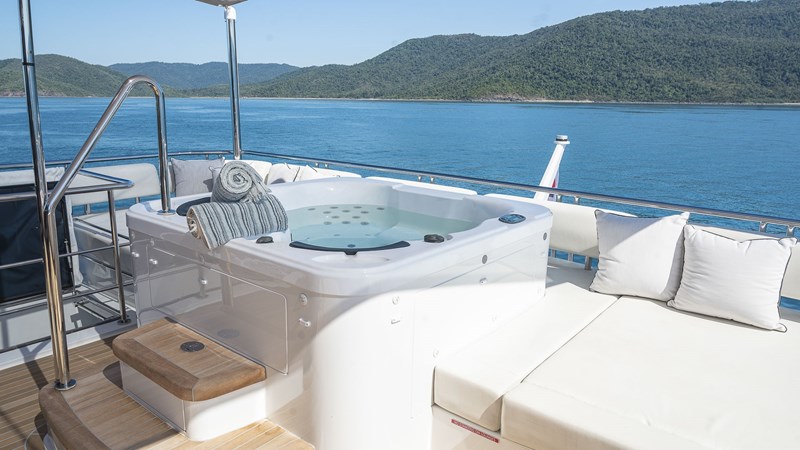 The yacht’s exterior exudes a contemporary charm; the lower deck swim platform provides immediate access to a beach club fitted with rain shower and ample refrigeration. Ascend from the main deck aft, where a welcoming aft sofa and open-air dining setup invite leisurely meals, to the foredeck that offers additional seating and dining options. Here, guests can revel in panoramic vistas in a convivial atmosphere. The foredeck is adorned with plush sofas and sunbeds, crafting the perfect oasis for sunbathing and socialising. The sundeck is an expansive retreat designed for entertainment, complete with sunbeds, a jacuzzi, a bar, BBQ, and comfortable seating adjoined to the opulent sky lounge and helm.