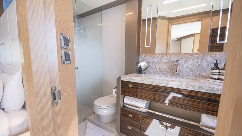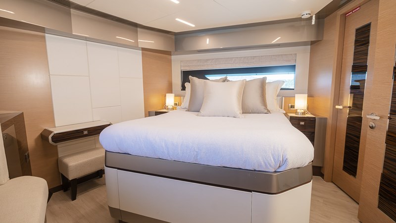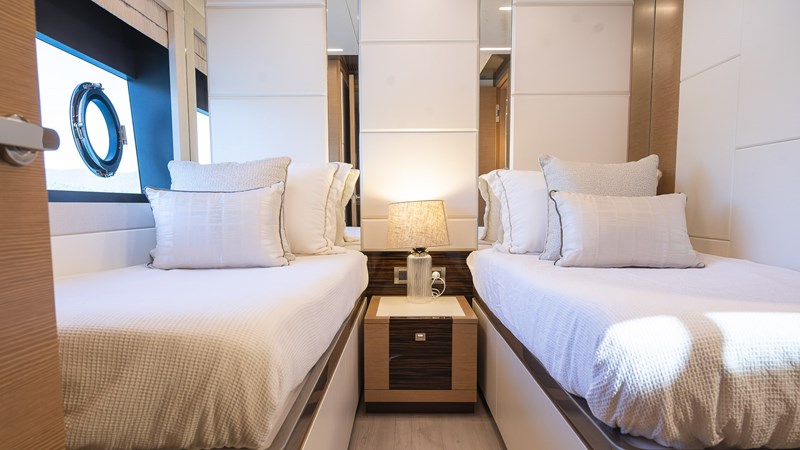 Inside, the Ocean Alexander 26 R greets you with a spacious and exquisitely designed interior. Each space is crafted for comfort, from the stylish saloon to the four luxurious staterooms. The interior design harmoniously blends warm tones with contrasting dark and light hues, accented by high-quality finishes and rich textures. The saloon invites social interaction, featuring a central coffee table, plush sofas, and armchairs, all bathed in natural light thanks to full-height windows and sliding doors. The formal dining area, seating 8, seamlessly connects to the main areas of the yacht, including the galley and technical spaces. Below decks, there is spacious VIP forward cabin featuring an island walk-around queen bed, a fullbeam master stateroom mid-ships with his and hers ensuites and his and hers walk in robes, and two twin rooms, each with ensuite. The crew quarters, situated aft on the lower deck, ensure up to 3 crew members can be accommodated with ease.