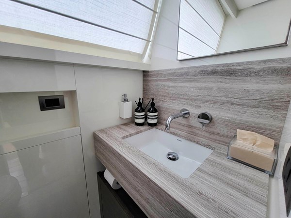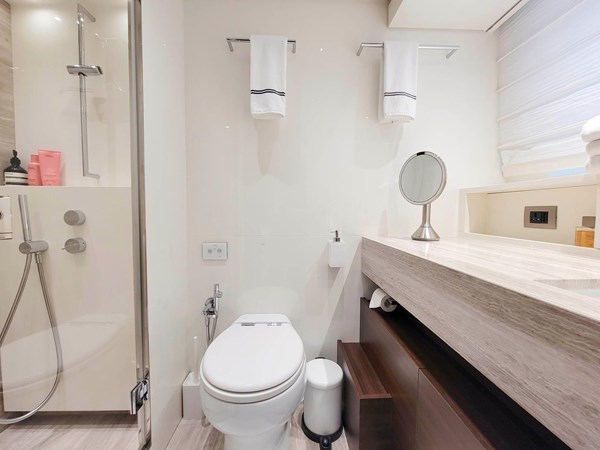 There are four luxurious cabins, each with its own en-suite. Two of the cabins feature double beds, while the other two offer twin beds, accommodating a total of eight guests. In addition, the yacht boasts two crew cabins, each equipped with bunk beds, providing sleeping quarters for a crew of four.