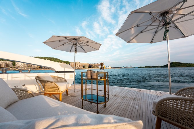 The spacious, light-filled salon celebrates open-plan living, highlighted by a custom-made unique dining concept seamlessly integrating the main deck living areas from the beach area all the way through to the entertainment focused open galley.