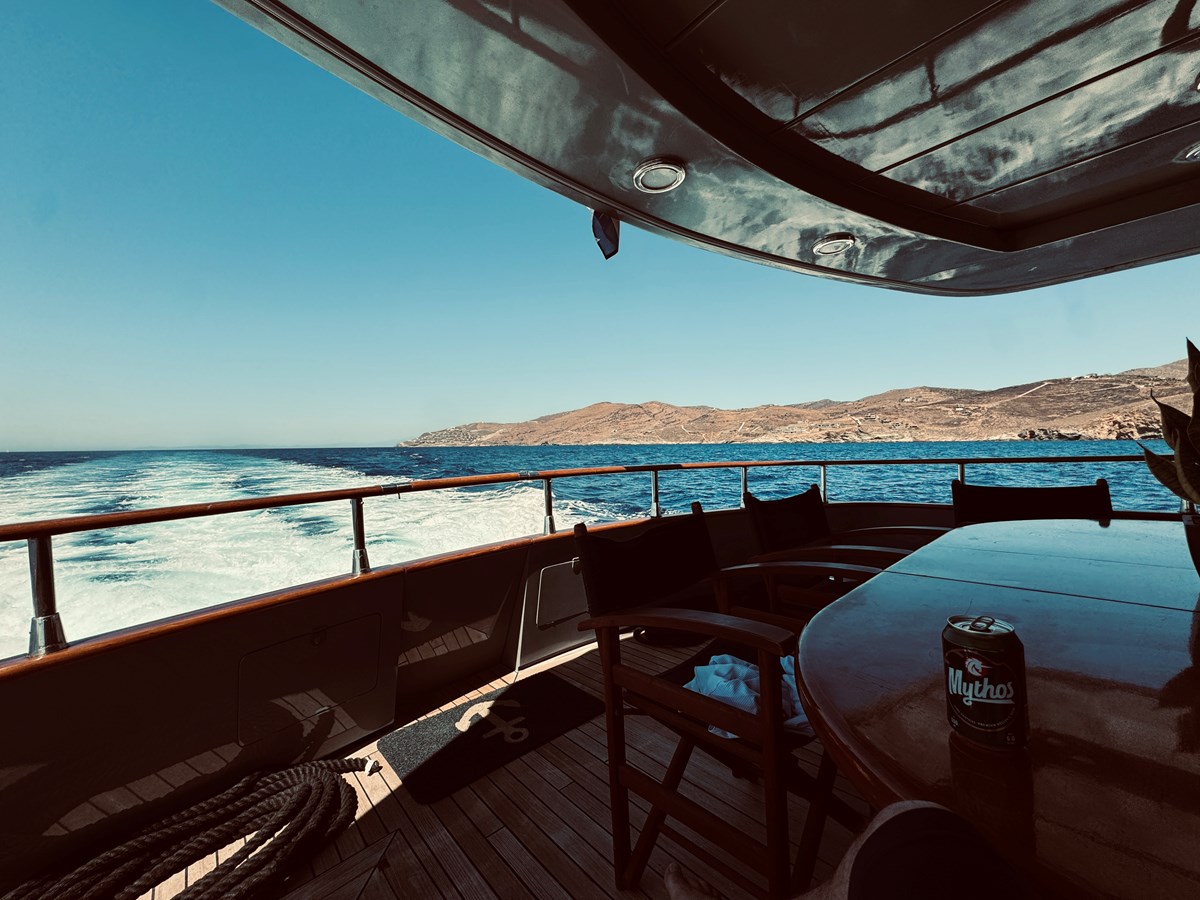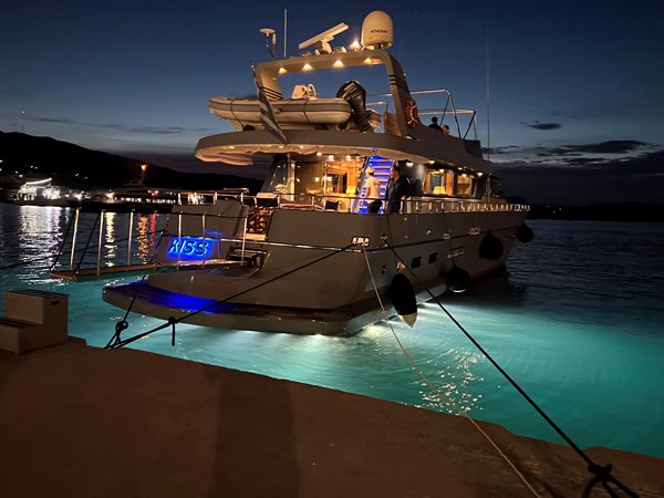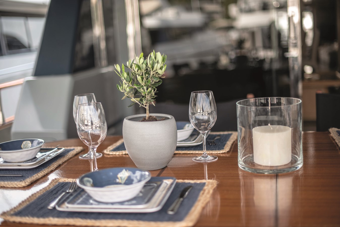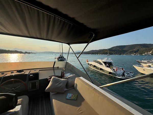The aft deck is elegantly appointed with a sofa running along the stern, complemented by an elevated table and additional chairs, creating the perfect setting for alfresco dining or relaxed outdoor gatherings comfortably sitting 8 persons. Twin staircases lead down to the swim platform on the lower deck, while an interior staircase ascends to the flybridge, where a sail canopy allows natural light to filter through while providing shade for guests.