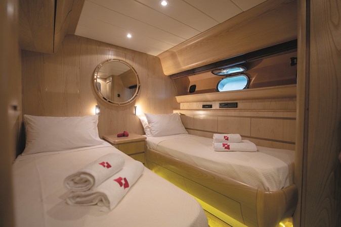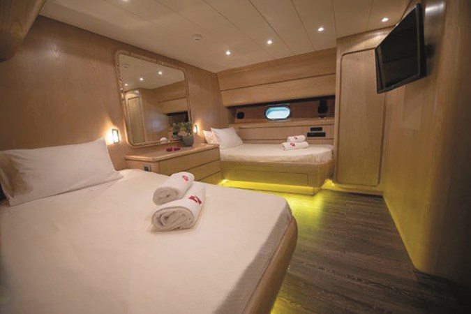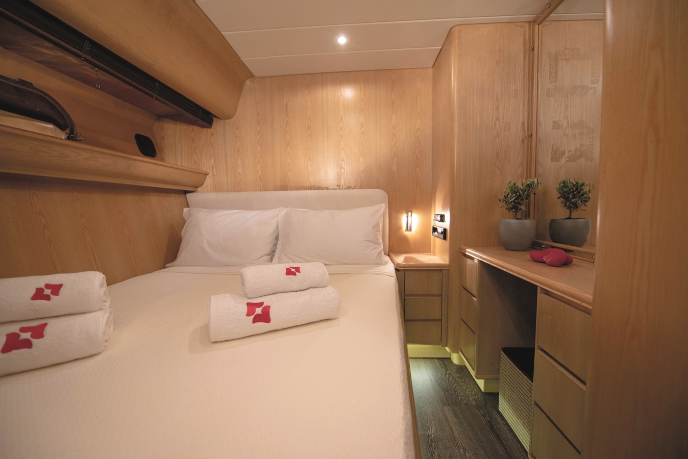 The lower deck features four well appointed guest cabins comprising a master suite, a VIP stateroom, and two twin cabins, one of which is additionally equipped with a Pullman berth, ensuring versatile sleeping arrangements.