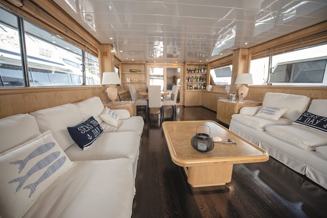 The main deck is dedicated to an expansive, open-plan living area, bathed in natural light thanks to floor-to-ceiling glass doors and windows aft. The salon offers an intimate formal dining space featuring a round table, a curved banquette, and additional chairs. Toward the aft, two large, gracefully curved sofas with side tables create an inviting lounge area, while a widescreen television mounted on the starboard wall provides entertainment, whether at anchor or underway.