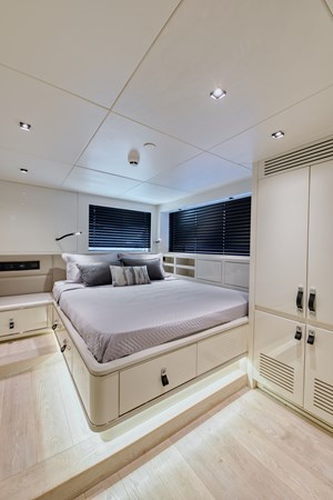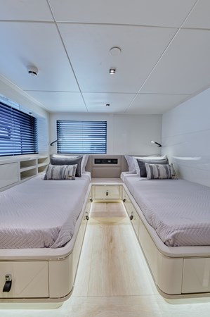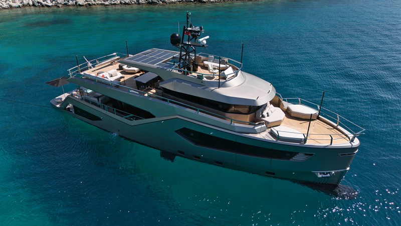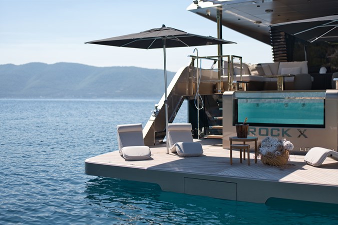ROCK X strikes the ideal combination between speed, comfort, and spaciousness. The world renowned team at Vripack designed a fast super displacement hull with a high, straight bow for intercepting rough seas. With an innovative sliding platform and a draft of only 1.8 meters, she can visit the most secluded areas in pursuit of adventure. All of this, combined with the yacht’s steel and aluminum construction , results in a remarkably comfortable cruising experience with impressive speeds. Furthermore, at under 24 meters, ROCK X retains all of the benefits of the European CE rules’ CE-A category. Additionally, ROCK X excels in providing unparalleled comfort and space to its discerning owners and guests. With a beam of 6.5 meters and three decks, the yacht’s voluminous, open-plan layout boasts 20% more internal volume than other comparable-sized boats. She can comfortably accommodate eight guests and four crew in a volume of 150GT . On the main deck, full-height windows give amazing uninterrupted views onto the water. This space has a lounge area with adjustable seating and a fully equipped minibar, while the dining area, which can seat up to 12, features one of the largest glass panels found on a yacht this size. The owner’s suite is on this level, characterized by a private drop-down balcony with underwater lighting and child-proofing features available at the press of a button. There are three guest cabins on the lower deck, a double and two twins, and the 15-square-metre bridge deck is given over to relaxing, with seating and al fresco dining. Sunshades create a further outdoor space on the main deck. Her Beach Club with Jacuzzi acts as a centerpiece for comfort and is just as much an integral part of her ergonomic functions. Her custom swim platform can accommodate a 6.5m (21ft) tender , but when unloaded, acts as the perfect connection to the sea. For additional details and for her full technical specifications, please reach out.
