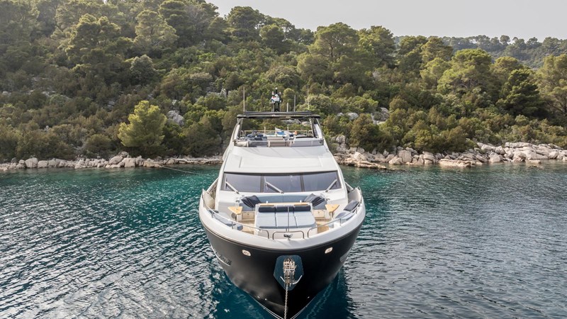 Outdoor living is equally impressive, with generous exterior decks. The yacht features the award-winning, cutting-edge X-TEND sunbed—an innovative feature that can be positioned to face aft at water level or elevated forward into the cockpit for optimal comfort. The expansive flybridge is a true highlight, offering ample sunbathing areas alongside a stylish alfresco dining space, ideal for enjoying meals with a view. Finally, the large swim platform provides seamless access to the sea, while the inviting Jacuzzi offers the perfect spot to unwind.