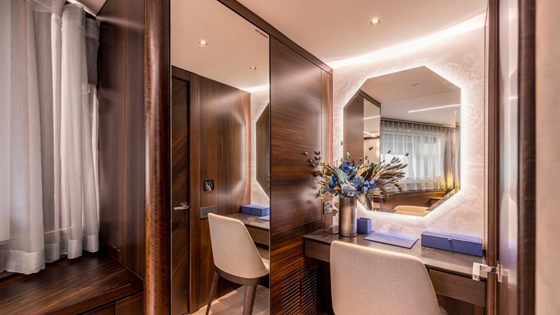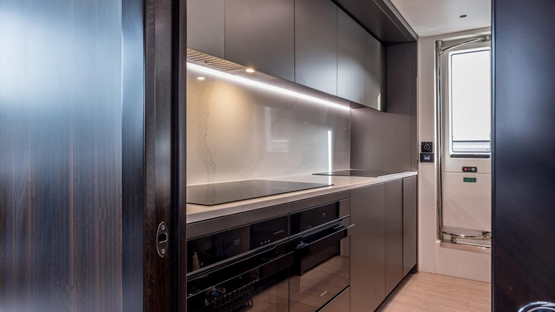 Blending contemporary elegance with innovative design, EXIT is both stylish and modern. The main salon is bathed in natural light, thanks to expansive windows that provide breathtaking panoramic views of the surrounding seascape. Accommodating up to nine guests across four well-appointed cabins, the yacht ensures both comfort and versatility. A standout feature is the master cabin’s custom-designed door, which seamlessly connects to the starboard guest cabin. At the guests’ discretion, this partition can be removed to create an expansive, unified suite, perfect for families or those seeking additional space.