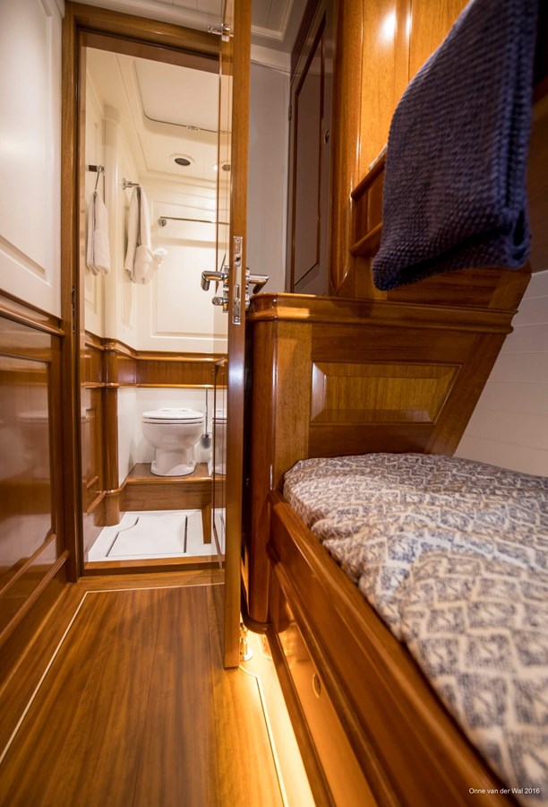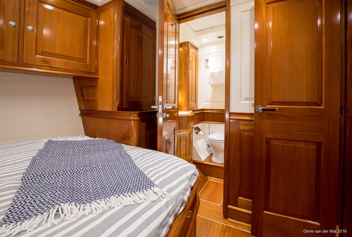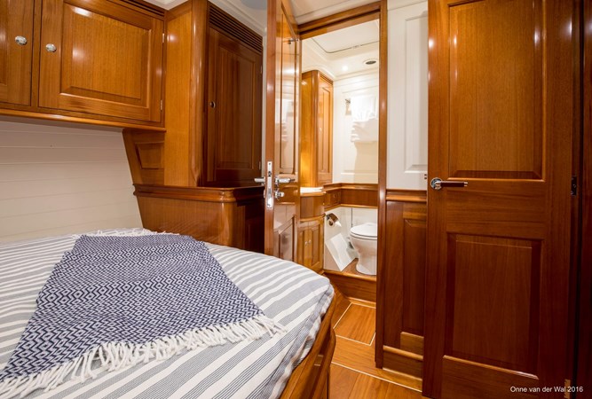 The aft owners cabin is located under the aft deckhouse therefore this cabin is very roomy, light and volumness.