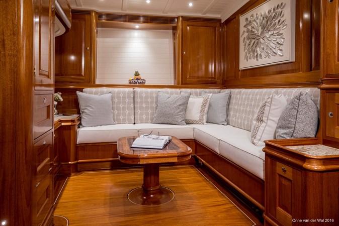 The interior features the master cabin aft with en-suite bathroom, adjacent going forward a small cabin with opposite the entrance to the engine room. Going forward to starboard the day head and laundry room, and upward the main deckhouse with dining table and Navigation station.