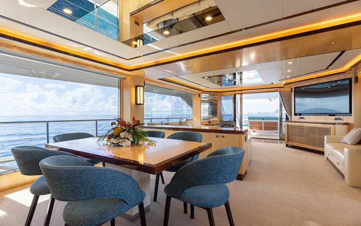 The expansive main salon features full-height windows that flood the space with natural light, while the owner’s choice of custom loose furnishings and a fully bespoke bar & formal dining area aft creates a warm, welcoming environment reminiscent of a high-end coastal residence. Forward, the open-concept galley has been reconfigured into a country-style kitchen with upgraded appliances, extended walk in pantry storage, including additional refrigeration and casual dining space along with office area—perfect for long stays aboard.