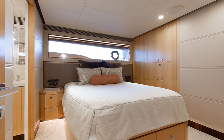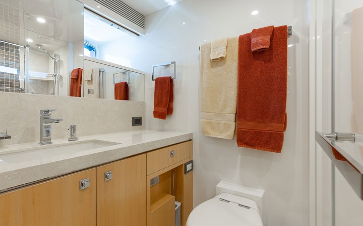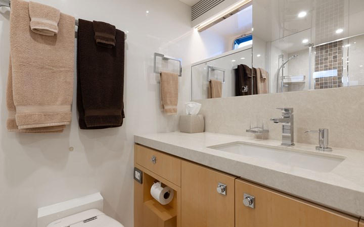 Below deck, the owner specified a versatile guest layout, including 2 mirrored VIP suites forward, ideal for accommodating both family and friends with ease. The full-beam master suite also located on the lower deck boasting personalized cabinetry, 2 walk in closets, oversized head with rain shower, premium stone finishes, and enhanced AV systems, offering a true retreat with five-star comfort. To compliment the guest accommodations, there is also a thoughtfully situated walk in laundry room with additional storage.