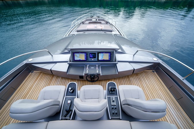 Constructed from advanced composite materials including carbon fiber she boasts a sleek, aerodynamic profile accentuated by Pershing’s signature side wings and an elegantly styled sundeck.
