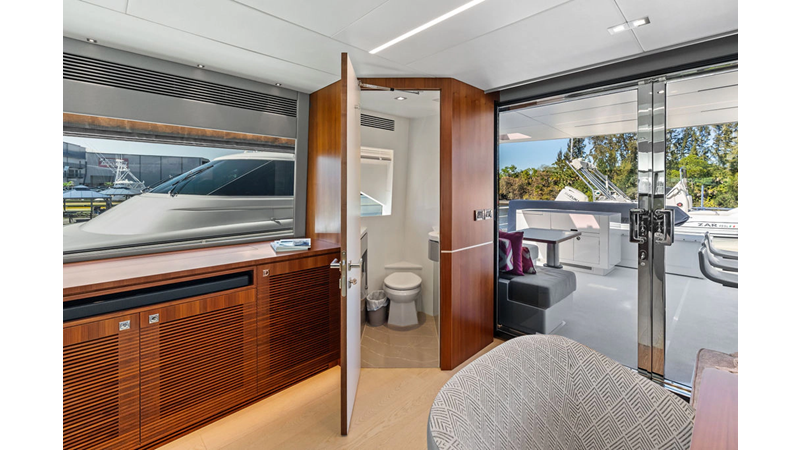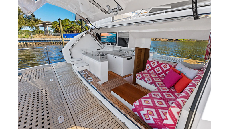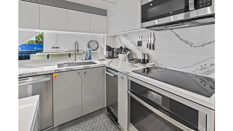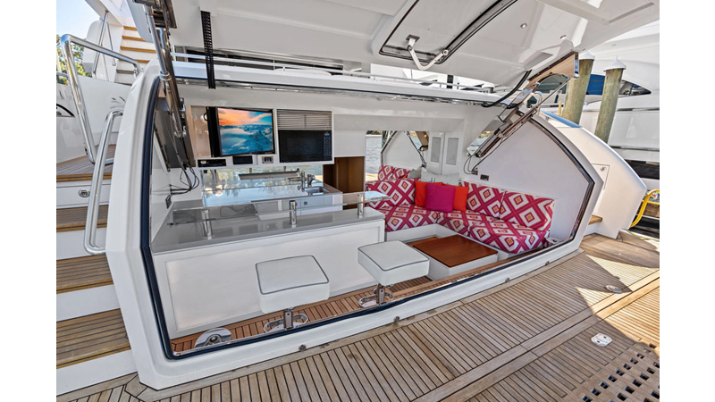 Starting our walk through back aft on the upgraded 2,000lb capactiy hydraulic swim-platform. This teak finished platform doubles as where you would dock your tender or she can also fit two Spark jet skis if configured properly. This owner choses to keep the space open (with tender kept on the upper deck) so not to interupt the views from the beach club that can be accessed by the garage door. Once opened you step down into the beach club that features a bar area with counter & two fixed stools, L-shaped settee, and full kitchen + TV great for catching your favorite game while remaining close to the water.
