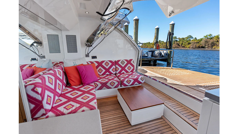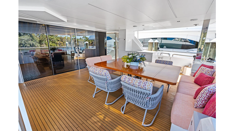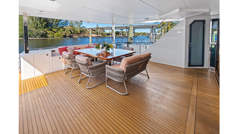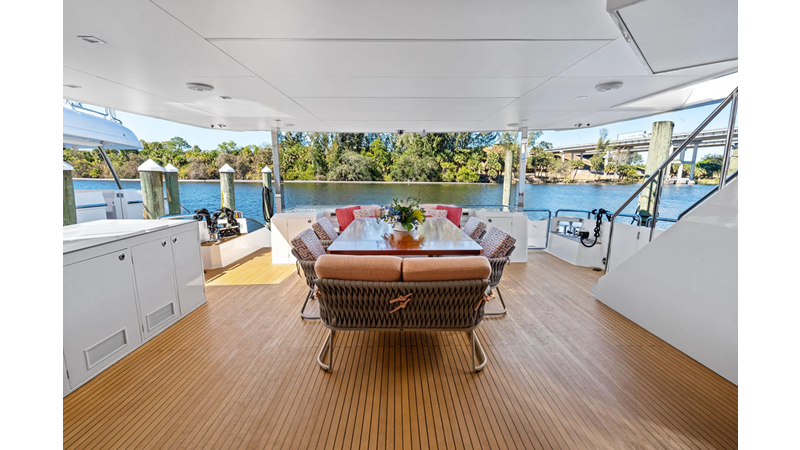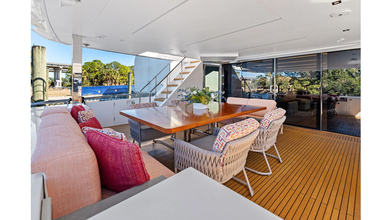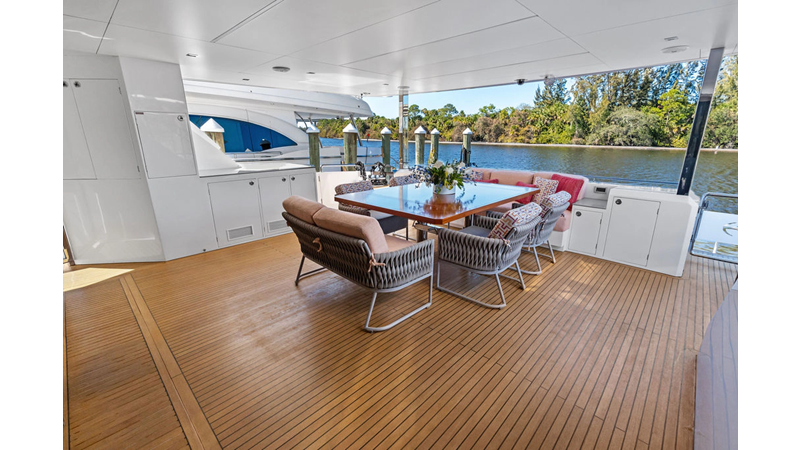 Once arrived on the main deck we have a large centerline table with chairs and built in settee surrounded by teak decks. Full walk arounds to both port & starboard continue forward to the bow. Fold down TV compliments the space.