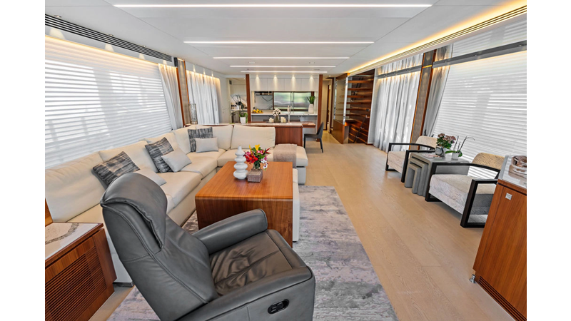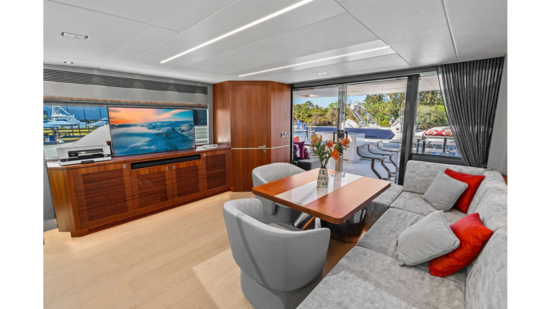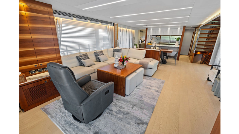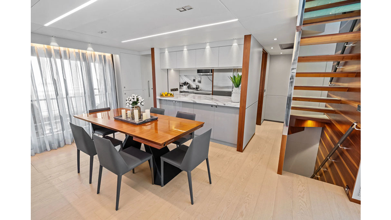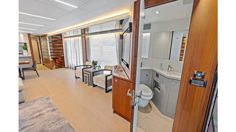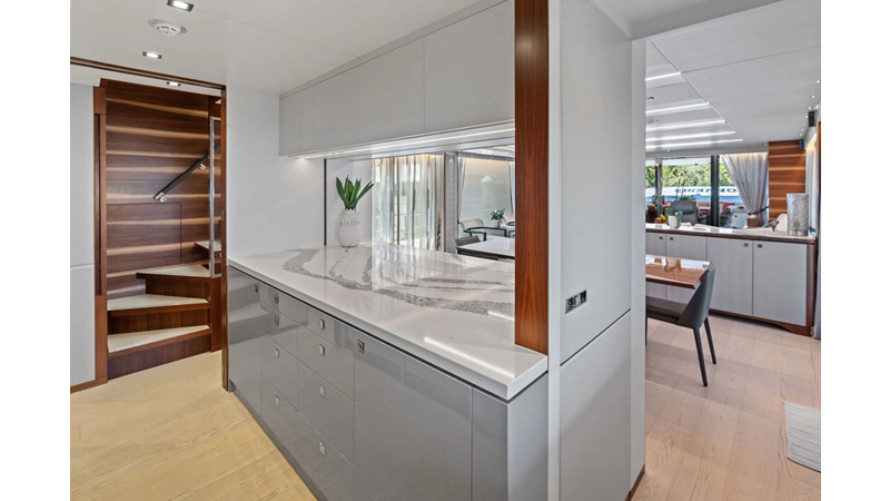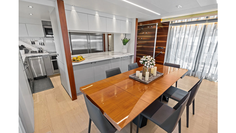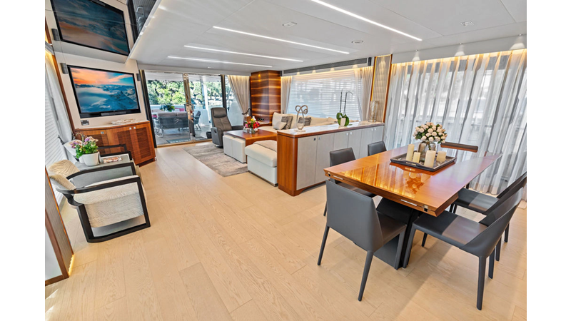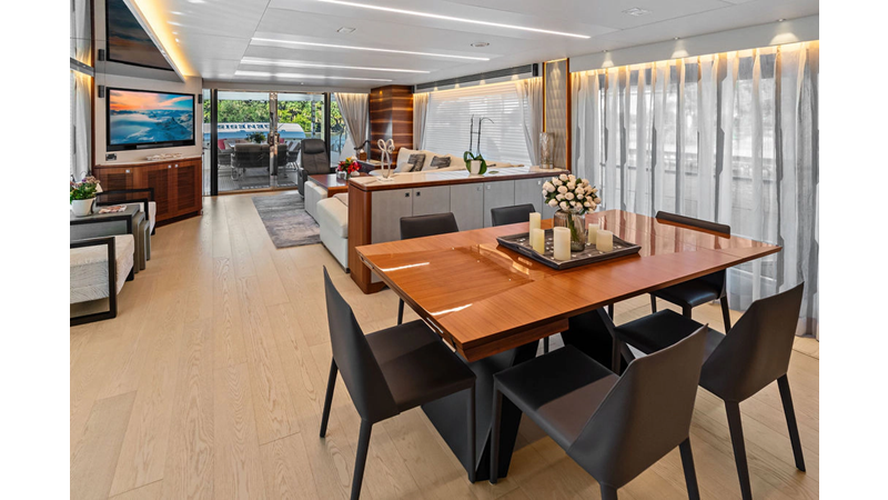 Stepping into the main salon through sliding glass doors you first notice light large plank oak wood floors that really brightens the space. We first arrive into the lounge area of the salon with L-shaped settee and two comfortable chairs opposite to startboard. Built in TV also to staboard and hidden behind this is a day head which I love the positioning of close to the aft deck so very smart configuration. Continuing forward you have your interior dining space that connects to the open galley which has a fantastic layout with open counter space great for family style service.