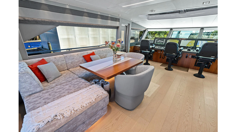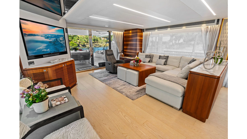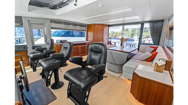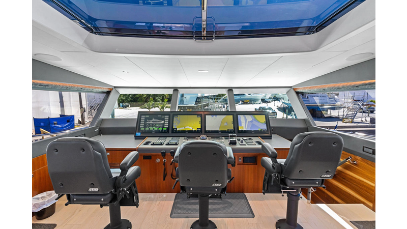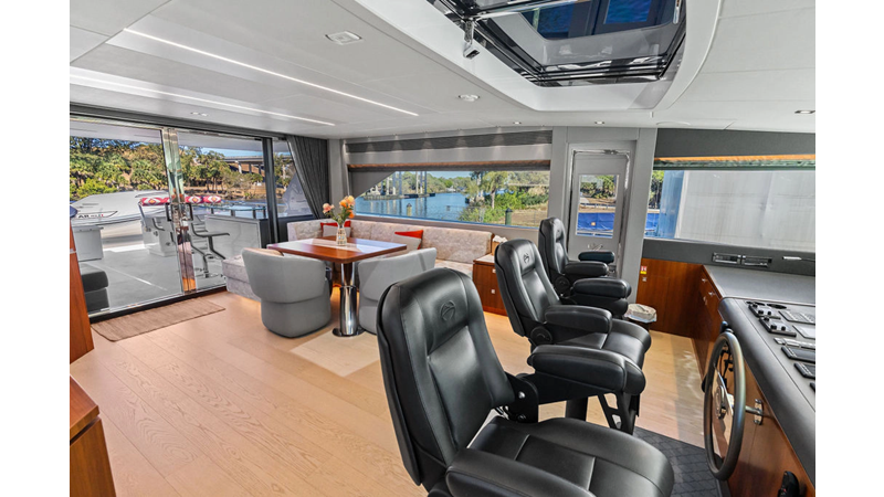 Taking the stairs to the upper skylounge and you have a space almost the same size as the lounge area in the main salon below. Another day head is located just inside the sliding glass doors that lead outside, you have another TV and of course the wheelhouse with 3 captains chairs. A fantastic glass bridge with 4 large glass panel monitors, those forward raked bridge deck windows I referenced earlier that allow for great visibility. Glass skylights float over the helm chairs allowing more natural light. And those large plank wood floors continue through the skylounge.