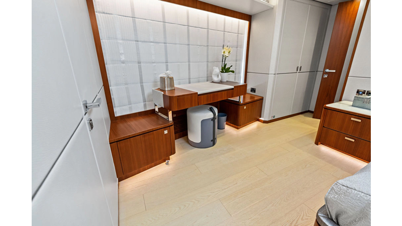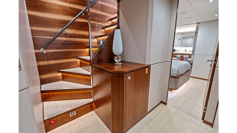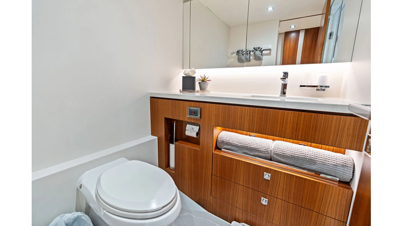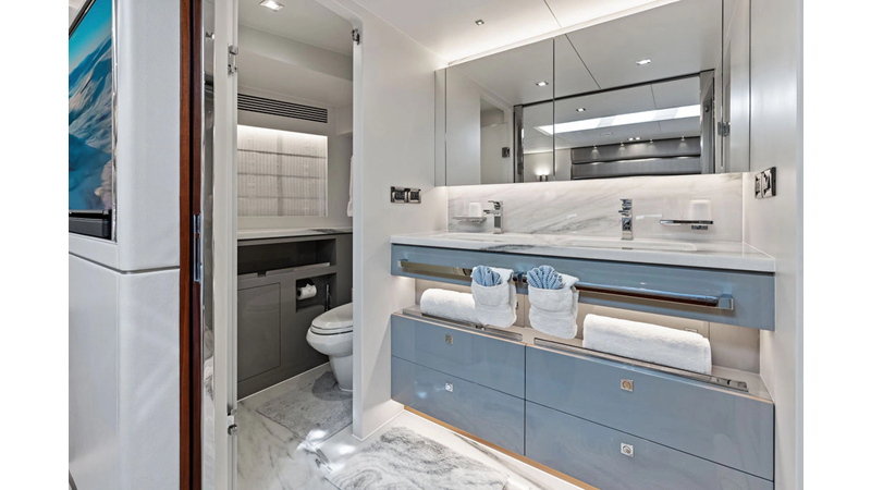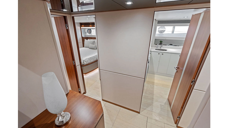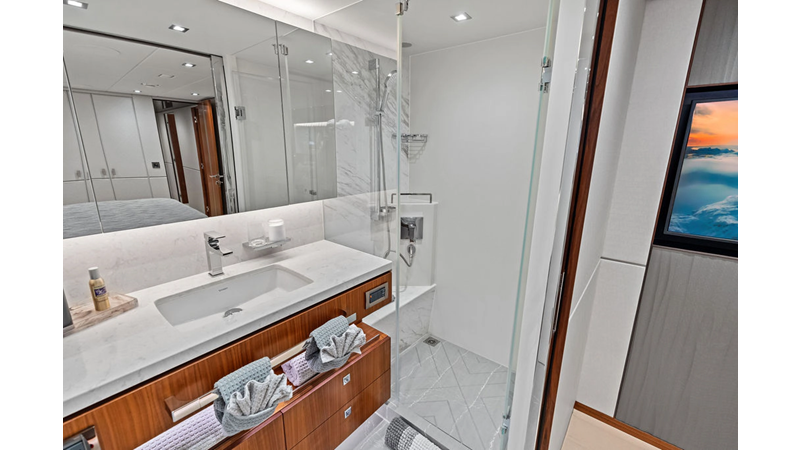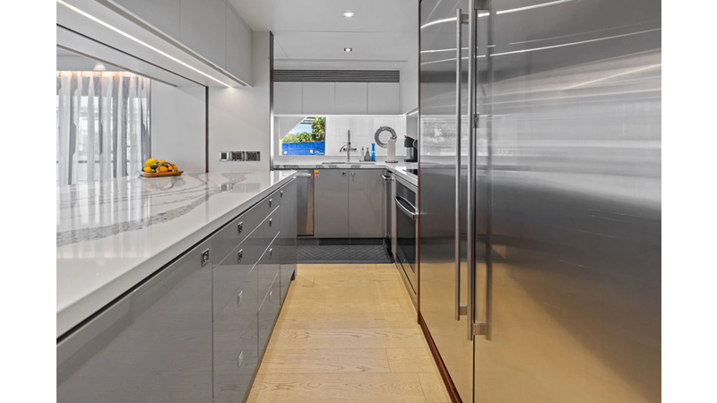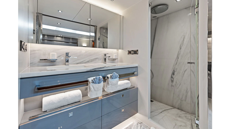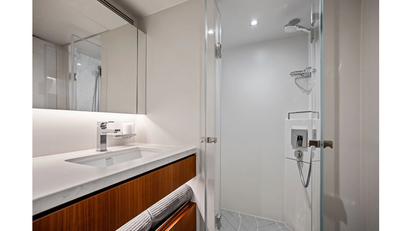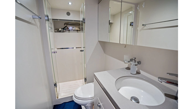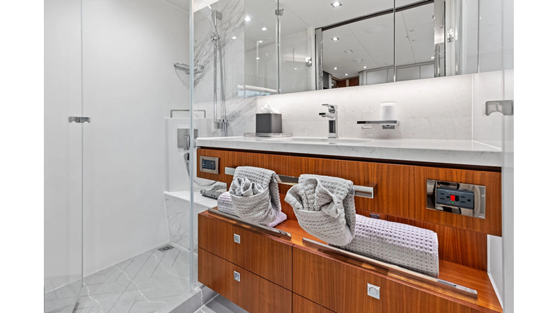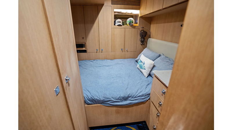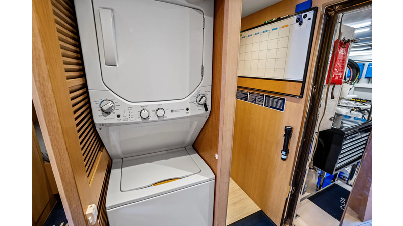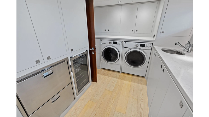 The lower deck has 3 guest cabins all of which are ensuite sleeping up to 6 guests for a total of 8 in the owners party. You will also find what I would consider one of the most important spaces onboard for day to day operations which is the laundry/pantry area that has full size washer dryers, wine cooler, two refrigerator/freezer drawers, sink and laundry facilities. A fantastic space for storage, doing heads & beds and elevating the guests experience onboard and allowing the crew to really raise the level of service they are able to provide onboard. This entire deck has large glass windows allowing plenty of natural light to flood each cabin and laundry room.