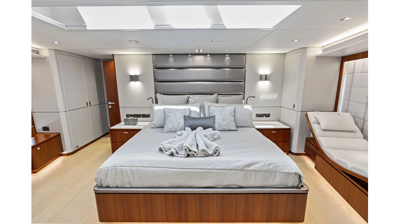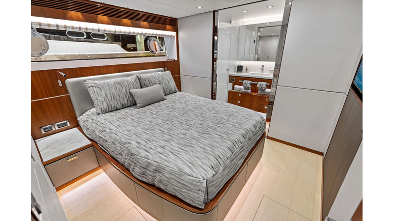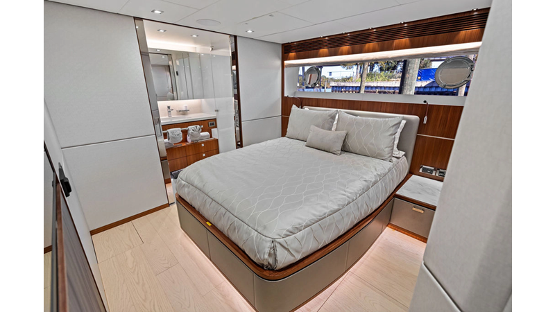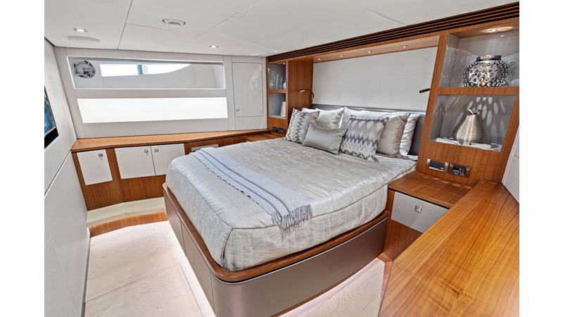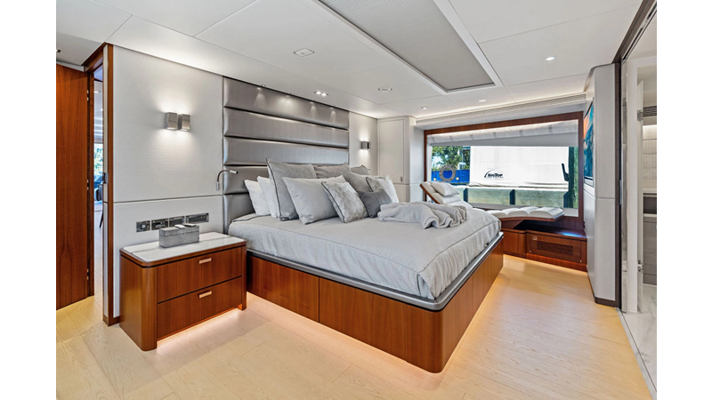 Designed by well respected naval architect Cor D Rover, the Horizon FD series revolutionized living onboard by allowing multiple lounge areas that can be utilized either while underway or at anchor. Her aggressive forward raked windows give the captain & crew excellent visibility while underway and her plumb bow or vertcile bow allows for fuel efficiency with her wave piercing bulb. The bow design also service another function as it creates valuable interior realestate allowing for substantial increased volume in the master cabin that is located forward on the main deck. Additionally space is created on the exterior that allows for a great forward facing sitting area and sunpads which is one of my favorite spaces to enjoy a sunset or cocktail cruise.