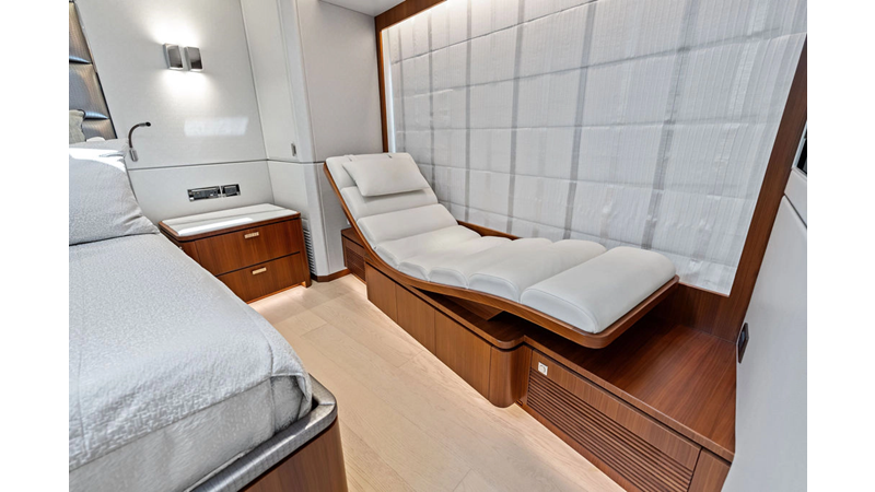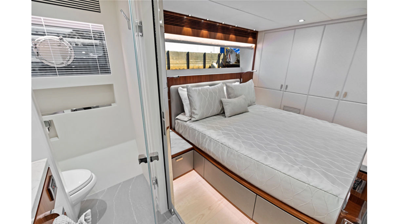 Moving forward to starboard you have a set of stairs that lead up to the upper enclosed sky lounge & wheel house area. And all the way forward on the main deck is a ‘best in class’ on-deck master suite with center line king, chaise lounge chair, vanity, and then a full beam ensuite with beautiful white marble, his & hers sinks, and rain shower.