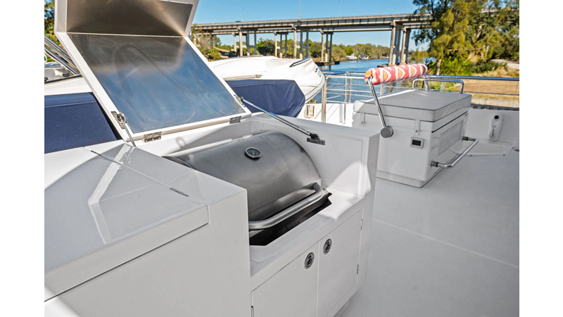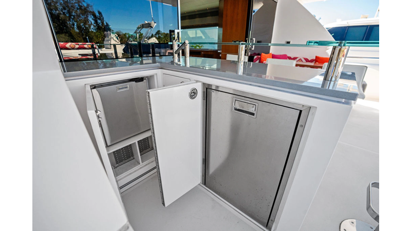 Heading outside you would be suprised by the volume of the exterior space considering the sky lounge is so substantial yet here we are with a full service bar with 4 bar stools, and another L-shaped settee opposite all of which are safely positioned over the hard top overhang allowing this space to be used in all weather conditions. Moving back aft you have a proper BBQ that is hidden in its own encloser, large deep freezer that doubles as a bench for sitting and then we arrive at the boat deck with 2,000lb capacity that allows for a substantial tender to be carried on deck.