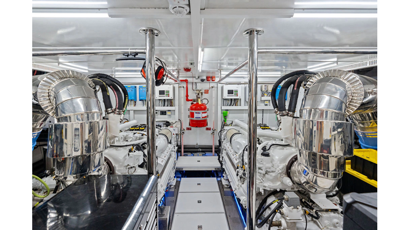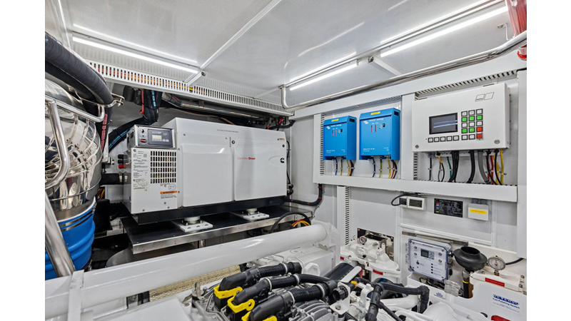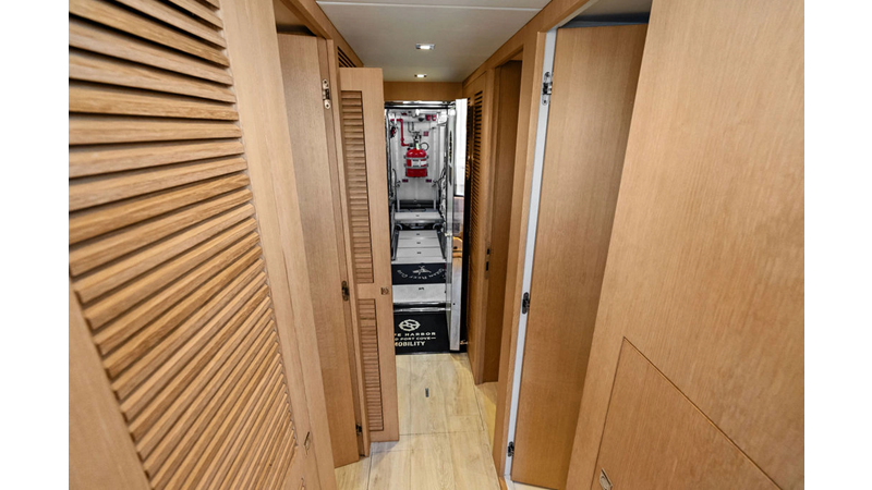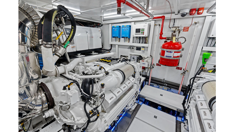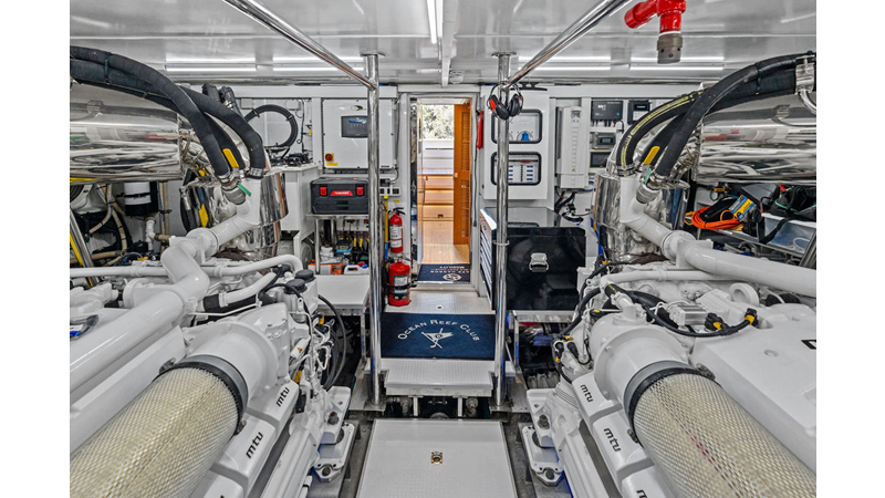 Stepping forward from the beach club you have a center line companionway that leads tolaundry facilities, storage, and two crew cabins one of which is a bunk room & the other has a full size berth that can sleep a solo captain or couple. Both cabins share a head. From here you continue forward where you have engine room access. The engine room is absolutely immaculate and features twin MTU 1600hp engines with roughly 1200 hours and twin Onan 29kw generators with roughly 1600 hours so very low use over the duration of their current life cycle. All services are current and up to date. Touching on the condition of the engine room and all machine spaces, GENESIS is run by an experienced captain and it shows throughout the yacht both cosmetically and more importantly in the machine areas onboard. This is a massive asset knowing she will survey extremely well come time of a buyers inspection.