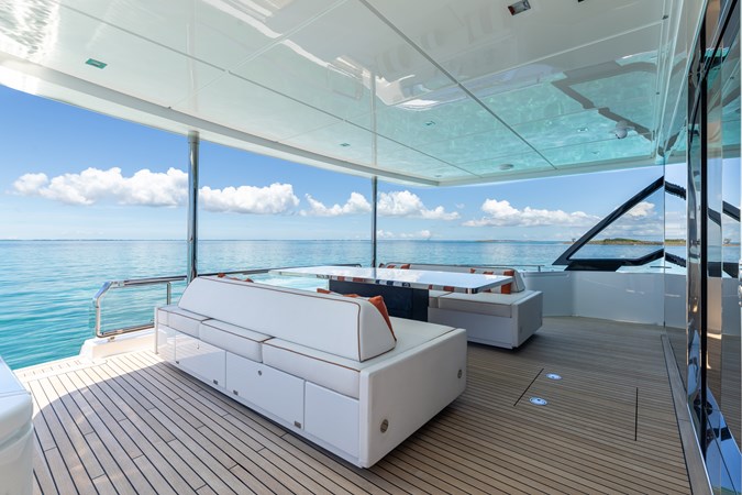 Step inside and you’re immediately immersed in natural light. The salon is surrounded by full-height glass windows that dissolve the boundary between interior and sea, creating an airy, open ambiance that evolves with every hour of the day. The layout is designed for both relaxation and entertaining—featuring a spacious lounge area aft, a formal dining space amidships, and seamless access to the aft deck through sliding glass doors.