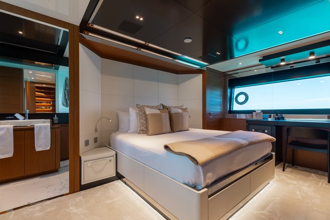 Rare for her size, KIYOMIZU features a full-beam master suite on the main deck, offering panoramic views, a private en-suite with walk-in shower, and a walk-in wardrobe. Below deck, the guest accommodations include: