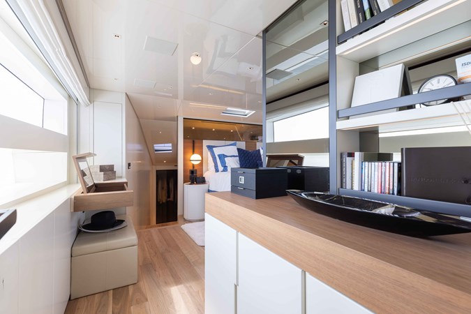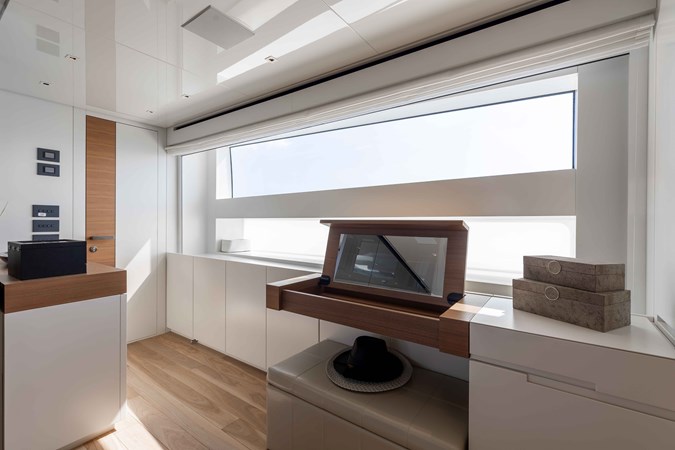 Innovative layout features are seamlessly integrated throughout the SL90A: an expansive full-beam on-deck master stateroom and three spacious cabins below provide guests with unparalleled comfort. A hydraulic bulkhead section can be lowered at the touch of a button on the portside, revealing uninterrupted floor-to-ceiling views of the water from the salon. A spectacular open atrium stretches midships, connecting the bottom guest cabin deck to the raised pilothouse. Access and flow have been meticulously redesigned: an electric door from the master bedroom to the exterior deck of the bow facilitates swift access, while guests can also directly walk from the bridge deck to the bow sunbathing areas. Large skylights connect the sky and master bedroom to the shower, creating an abundance of natural light and fostering a sense of spaciousness.