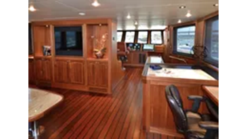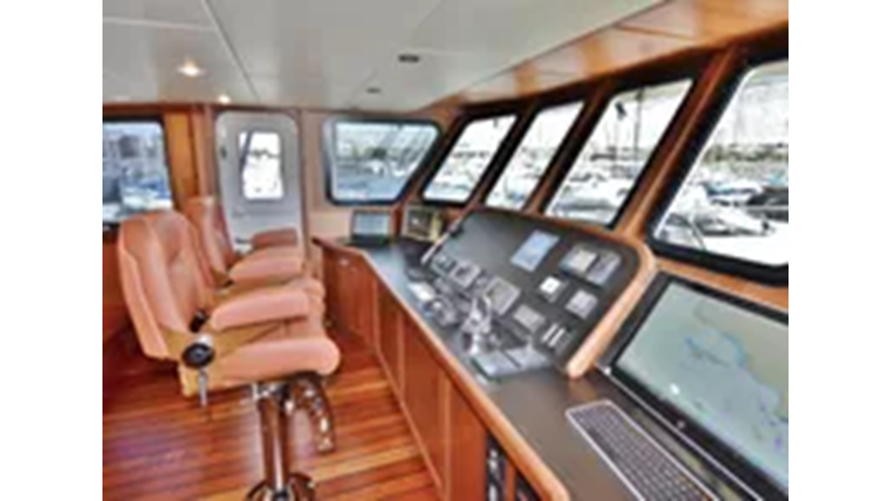 Pilot House is located on level three forward, complete with 2 ea. Stidd custom leather helm chairs, elevated settee for 6, navigation/office space with full size chart table and separated entertainment lounge area with built in L-shaped couch.