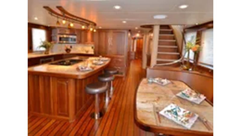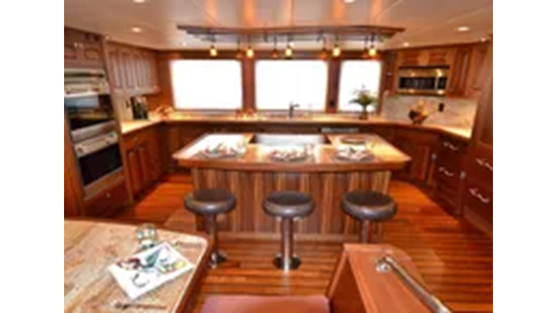 Galley is located amidships on level two. Country Kitchen Style with large 6 person dining settee and chairs at galley island.