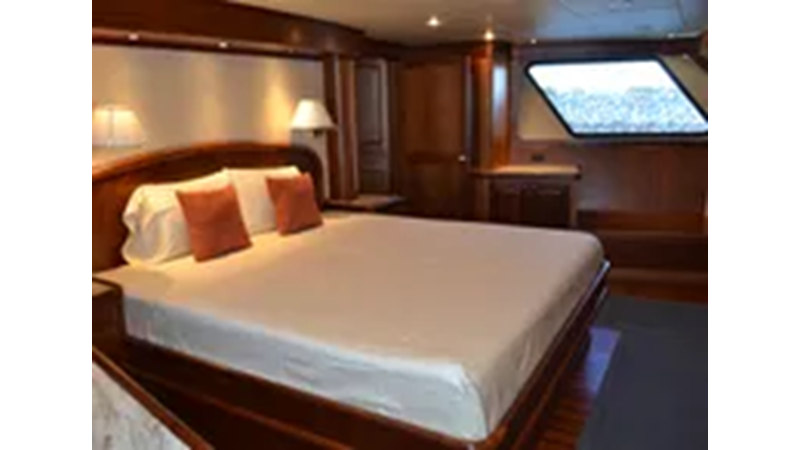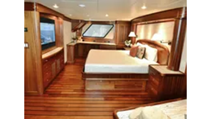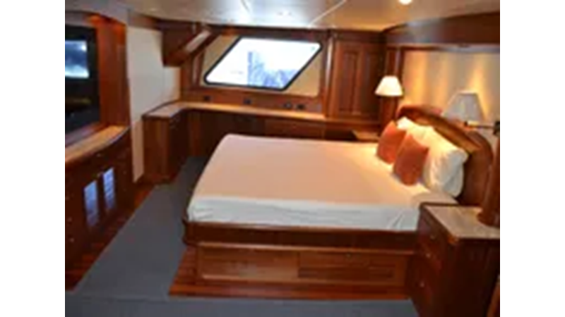 Master Stateroom is located on main deck forward of amidships in bow area. Full width master with king size bed located on main deck forward of amidships complete with fainting couch, night stand cabinets, office desk, 50” flat screen TV and large windows port and starboard with Lutron electric roman shades.