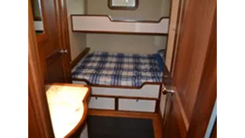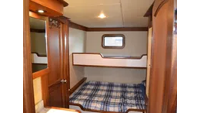 Crew Quarters are located forward of the engine room, level one. One double and one twin berth, counter tops with storage cabinets, bathroom with marble shower.