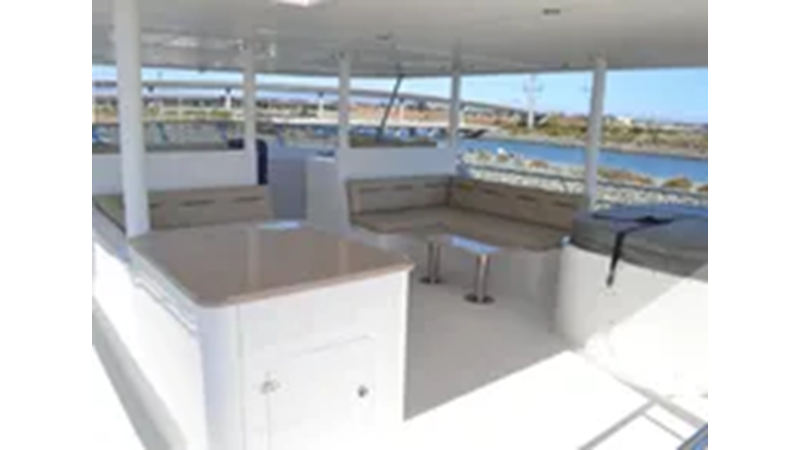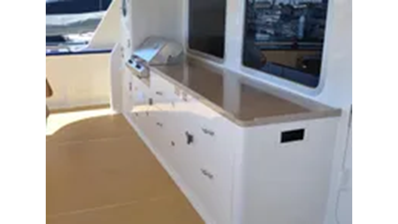 Aft Deck is located aft of saloon on level 2, with oval dining table for 8 persons, complete with electric BBQ, sub zero refrigerator and freezer with pull out drawers.